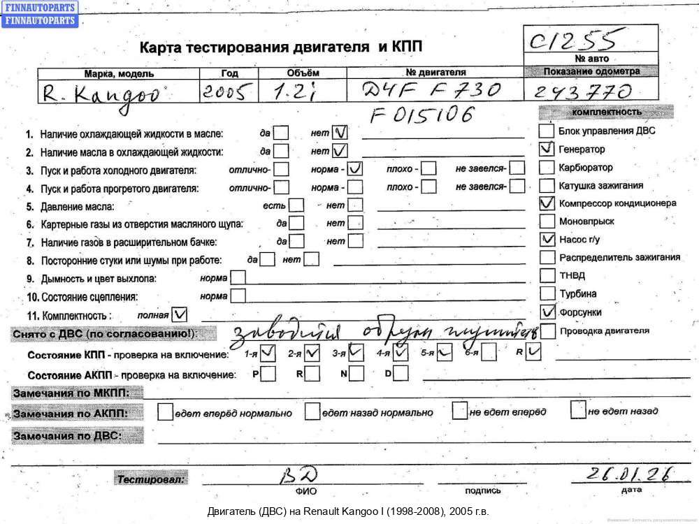 | Нижний Тагил | 2003 | 7701474900, 2003, 1.5л, Дизель, DCI, K9K 704, Б/Н (K9K 704), 7701474900, Фургон, белый, Б/Н (K9K 704) | - | К | С | ТУ, эмульсия - нет, состояние ГРМ - нормально, поддон - нормально, клапанная крышка - нормально, | |||